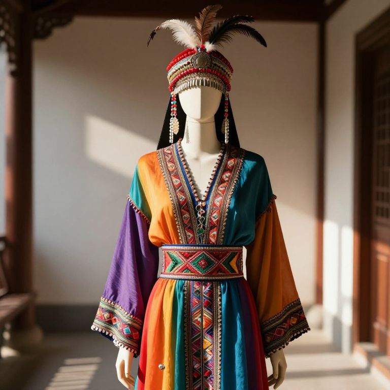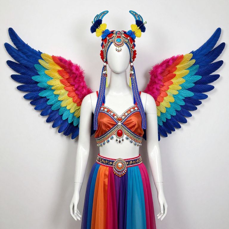 A detailed mannequin standing in a stylized, modern interior space, wearing a vibrant and colorful headdress made of flowing fabrics, beads, and metallic elements, paired with ornate accessories such as crystal pendants, dangling chains, and handcrafted jewelry. The mannequin has a sleek, polished silhouette with a smooth, reflective surface that catches the light, giving it a lifelike and slightly animated appearance. The scene is set in a creative, art-inspired environment with soft ambient lighting, emphasizing the rich textures and bright hues of the headdress and accessories.