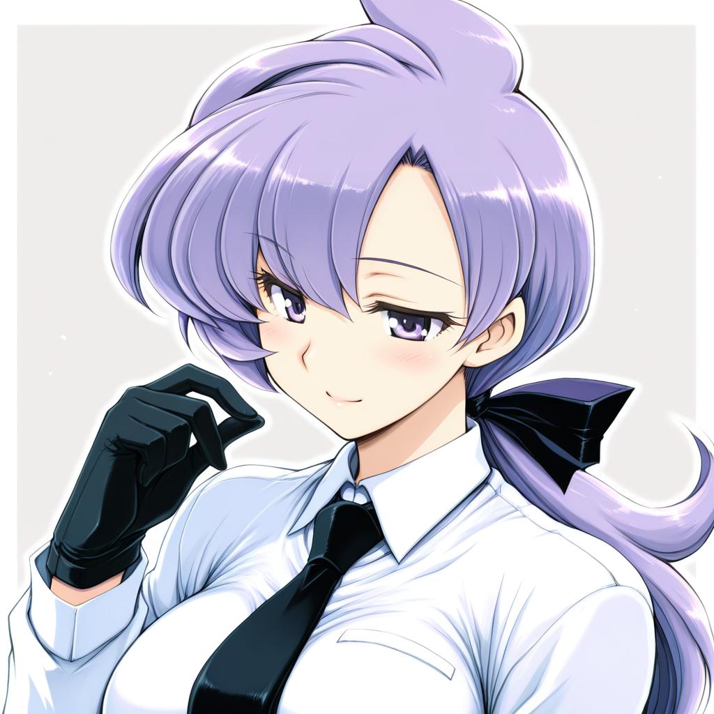 Anabel (pokemon), pokemon, 1girl, purple eyes, eyelashes, purple hair, long hair, ponytail, low ponytail, hair ribbon, black gloves, white shirt, collared shirt, long sleeves, black necktie, by artist sakurazawa izumi, leet
