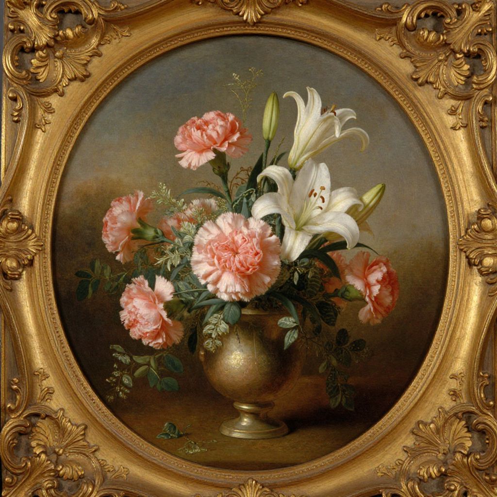 Handgemalt detailed floral still life, soft pastel color scheme, delicate brushwork capturing light reflections, vintage style with fine textures on canvas, naturalistic rendering of roses, tulips, and daisies in a rustic vase setting with subtle background.