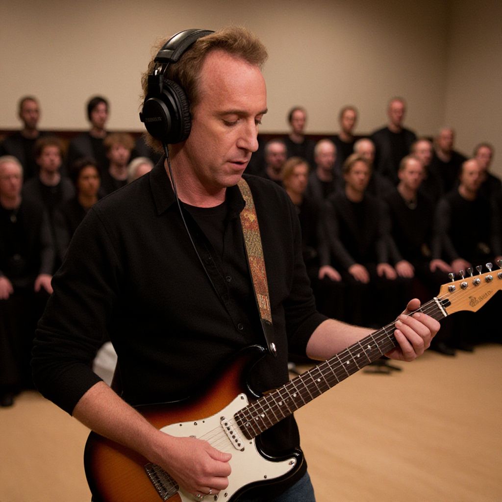 Photograph of a middle-aged white man with short brown hair, wearing black headphones and a black shirt, playing an electric guitar with a sunburst finish and white pickguard. He stands in a dimly lit room with a wooden floor, focused intently on his guitar. In the background, a large group of people, predominantly white, dressed in black, sit attentively, watching him. The man's expression is concentrated, and his right hand is strumming the guitar while his left hand is positioned on the fretboard. The image has a slight blur effect, emphasizing the guitarist as the focal point.