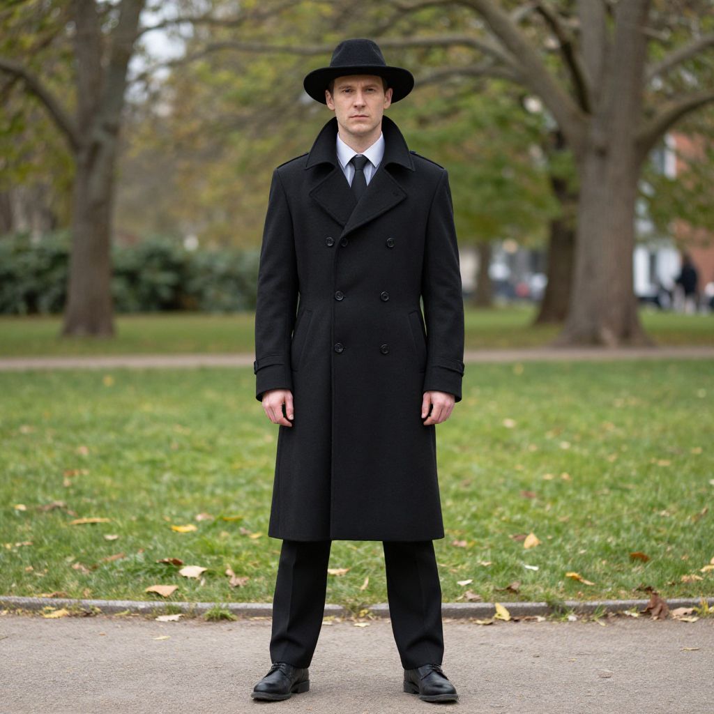 Photograph of a young man in a black overcoat, black hat, white shirt, black tie, and black pants standing in a park with green