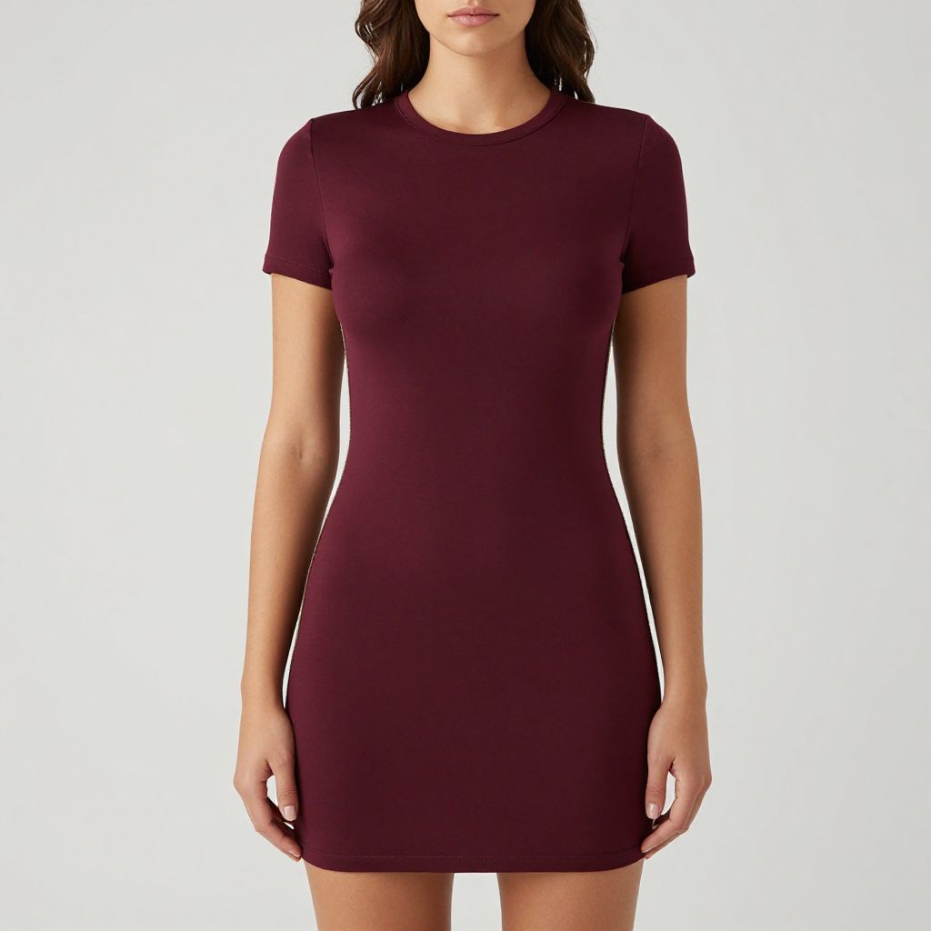 Photograph of a woman standing against a plain white background. She has light skin, shoulder-length wavy dark brown hair, and is wearing a form-fitting, short-sleeved, burgundy mini dress that accentuates her slim figure. Her arms hang naturally by her sides, and her face is partially visible but not the focus of the image. The dress has a simple, round neckline and a smooth texture. The lighting is even, highlighting the color and fit of the dress. No other objects or accessories are present in the image.