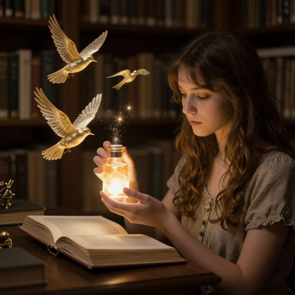 In a dimly lit library, a young woman holds a glowing bottle of ink as golden, ethereal birds take flight from the pages of an open book, their wings shimmering with sparks of magic.