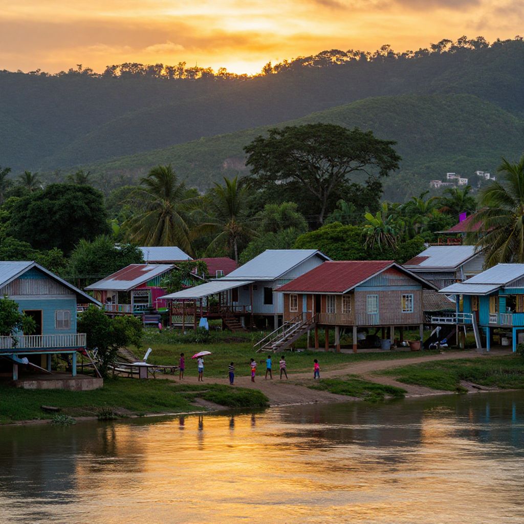 Jamacan village scene at sunset, vibrant colors, tropical vegetation surrounding quaint wooden houses, children playing near a calm river, lush green hills in the background, warm golden light reflecting on water, peaceful and lively atmosphere