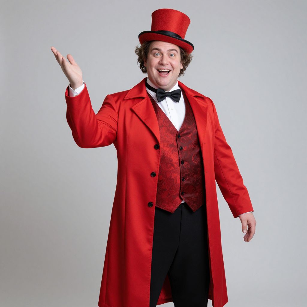 Photograph of a Caucasian man with curly brown hair, wearing a bright red top hat, red tailcoat, black waistcoat with red floral patterns, black bow tie, and white shirt. He stands against a plain white background, smiling broadly, and raising his right hand in a waving gesture. His expression is cheerful and energetic. The image is well-lit, highlighting the vivid red of his outfit, which contrasts sharply with the white background and his black bow tie. The overall style is reminiscent of a Victorian magician or performer.