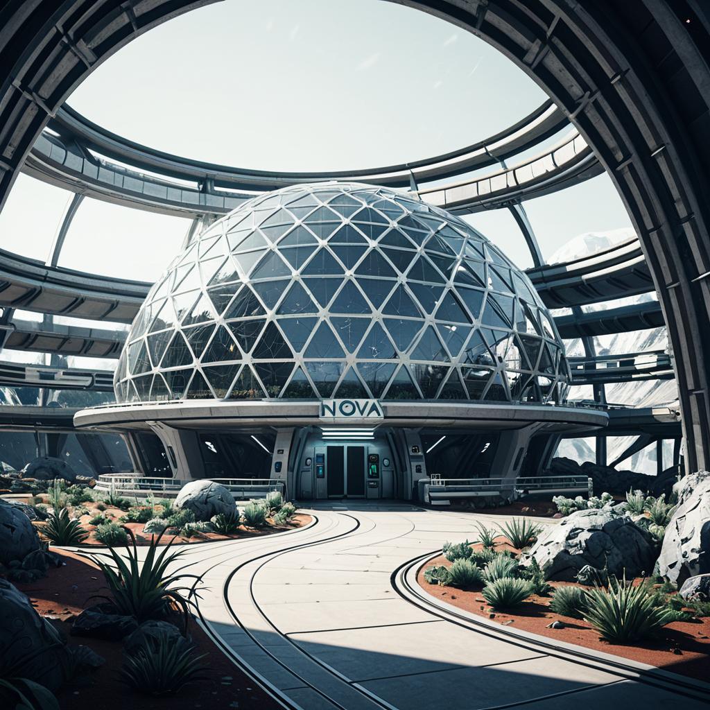 Create concept art for a station called 'Nova Archs' in a space colony management style. The building should showcase organic, bio-dome and adaptive architecture influences while maintaining a cohesive game world.