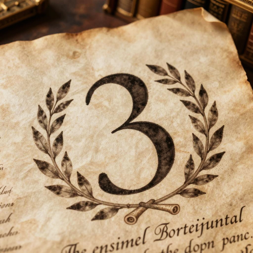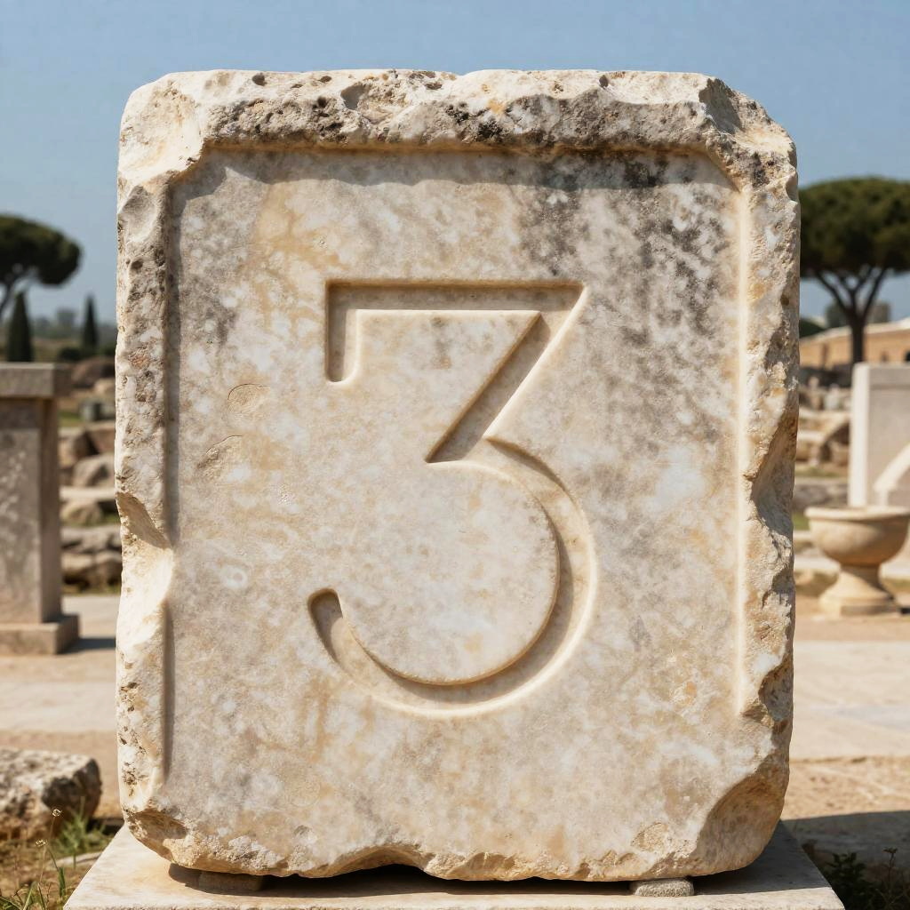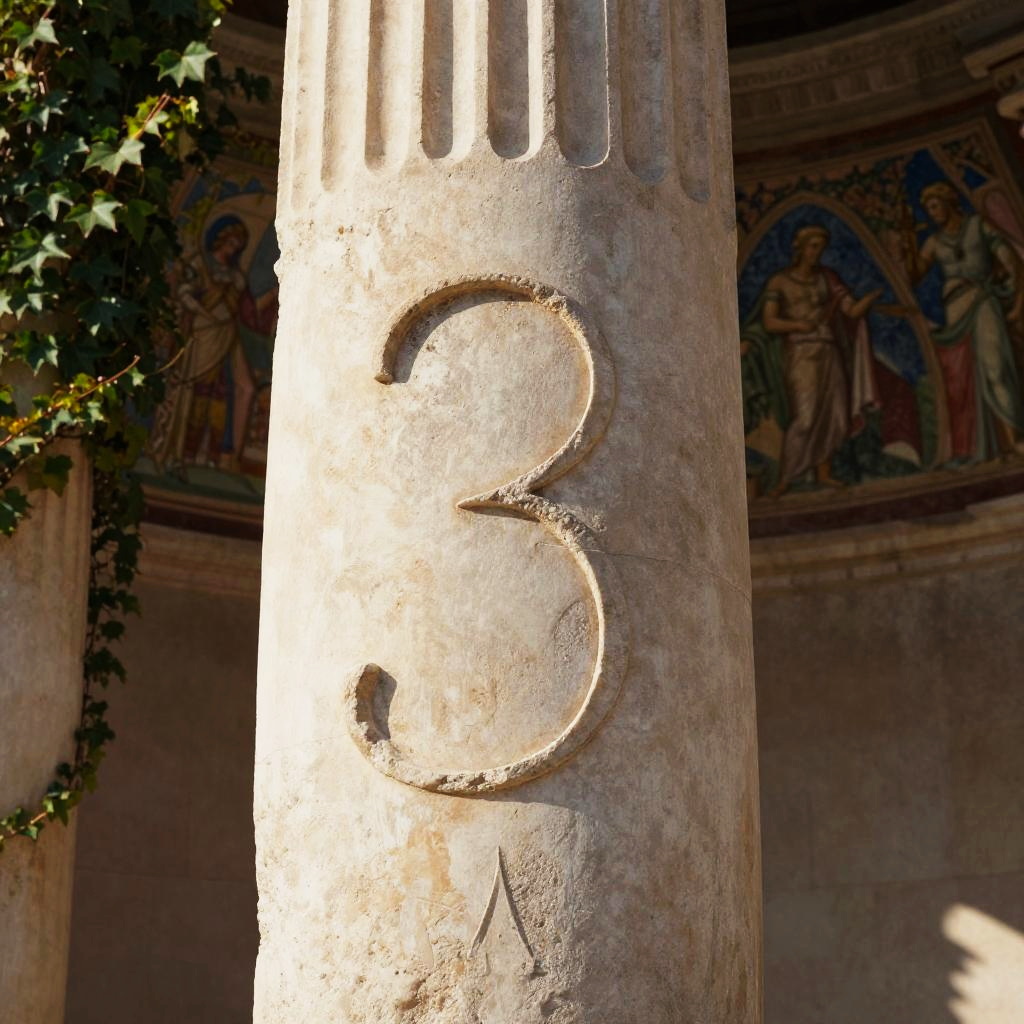 An artistic representation of Roman numeral 3 meaning integrated into a Roman architecture scene, etched on a large stone column bathed in warm sunlight, with surrounding ivy and faded frescoes, capturing the grandeur of ancient Rome.