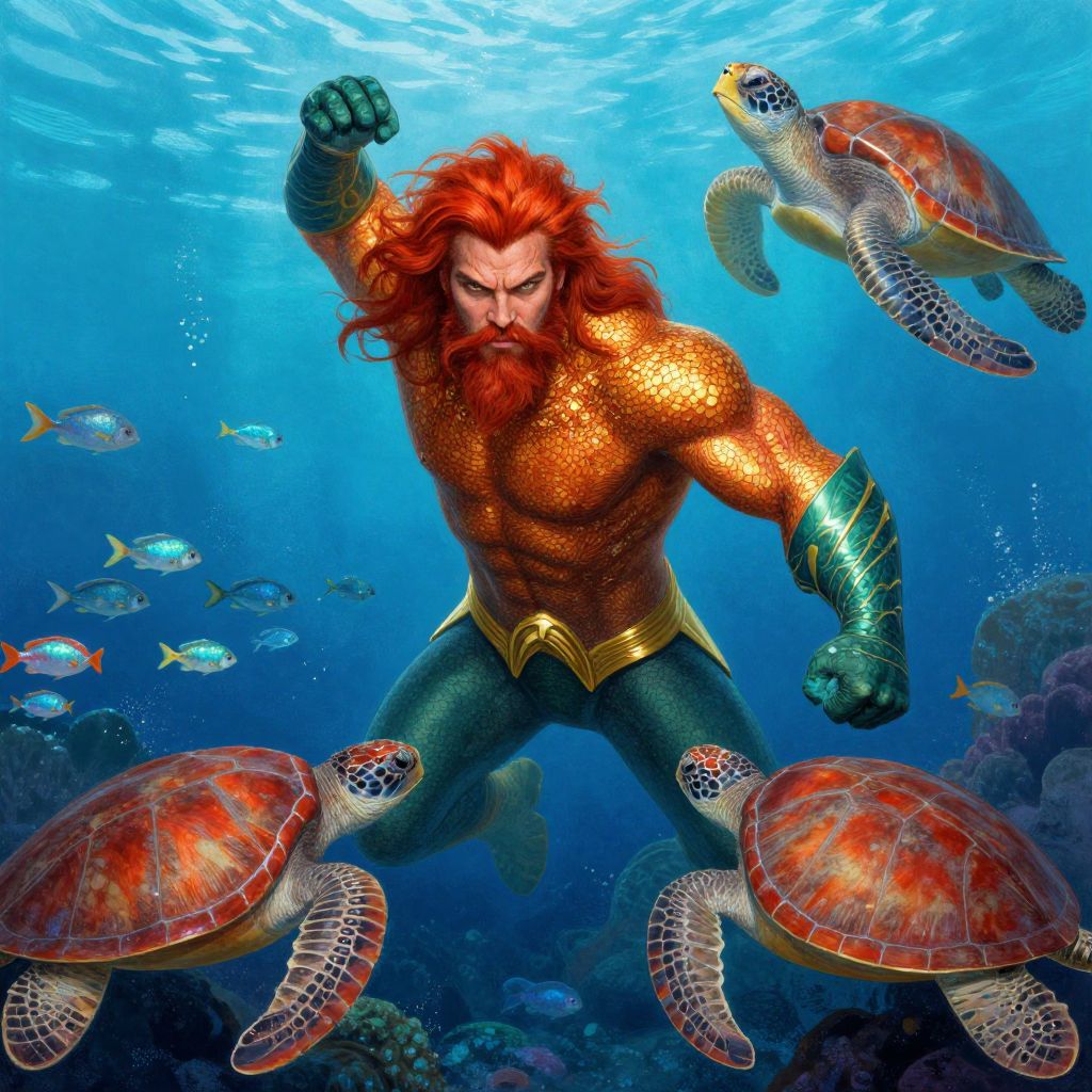 Red-haired Aquaman commanding the ocean depths, surrounded by a school of shimmering fish and majestic sea turtles, dynamic pose with intense gaze, oceanic fantasy setting, vibrant colors and intricate details in a painterly style.