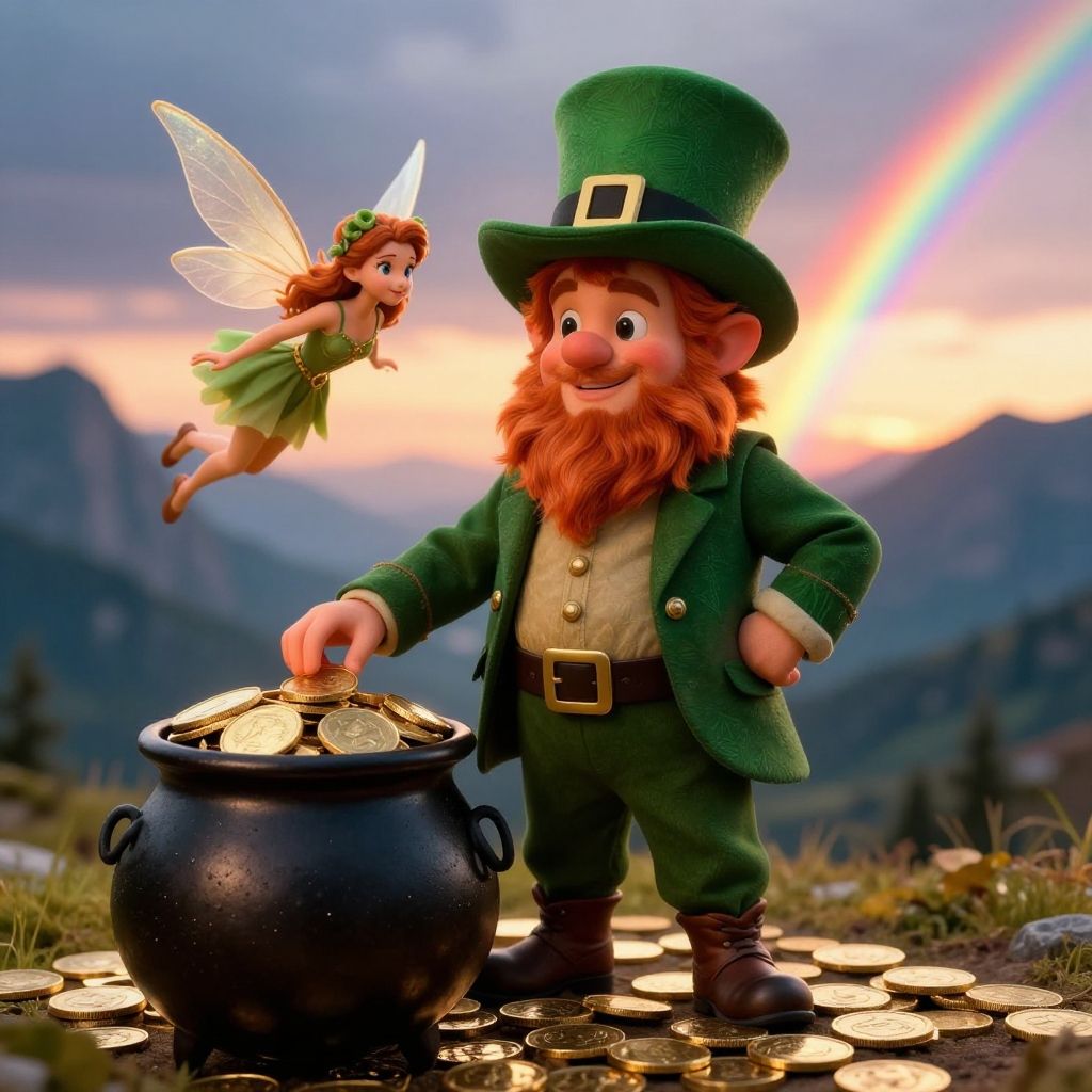 A vibrant CGI illustration depicts a cheerful leprechaun with a green top hat, green coat, and tan vest, holding a black cauldron filled with gold coins. He has a large red beard and a wide smile. Beside him, a tiny fairy with translucent wings, green dress, and flower crown hovers. The background features a colorful rainbow arching over a mountainous landscape at sunset. The leprechaun stands on a wet, reflective stone path, with the cauldron placed to his right. The scene is magical and whimsical, emphasizing the playful interaction between the leprechaun and fairy.