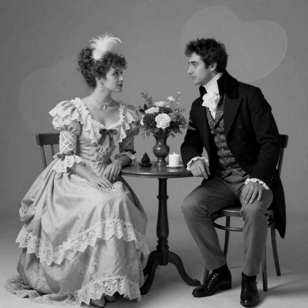 Black and white photograph of a couple in ornate, Victorian-style dresses with elaborate lace and feather details. Woman with curly hair, large puffed shoulders, and a voluminous skirt. Man with dark hair, high-collared jacket, and patterned fabric. They sit closely on a circular table with a floral arrangement, holding hands, and looking at each other with soft expressions. Background features large, abstract, translucent shapes. Table has a candle and small decorative items. Woman on the left, man on the right.