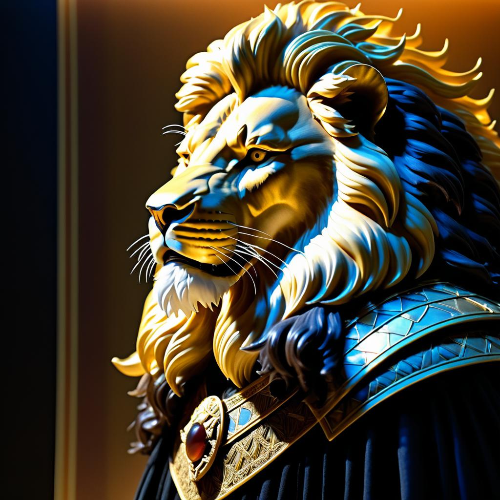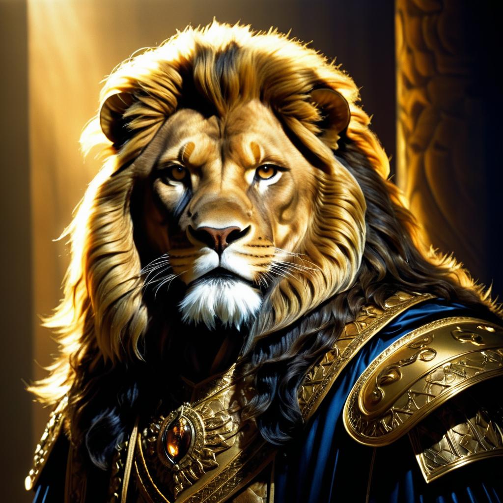 Ultra-realistic portrait of a noble lion depicted as a king wearing elaborate golden armor and a royal blue mantle. The lion has a detailed mane with light and shadow emphasizing a dramatic and cinematic atmosphere. The armor features intricate patterns and a central gemstone, styled in a fantasy art manner.