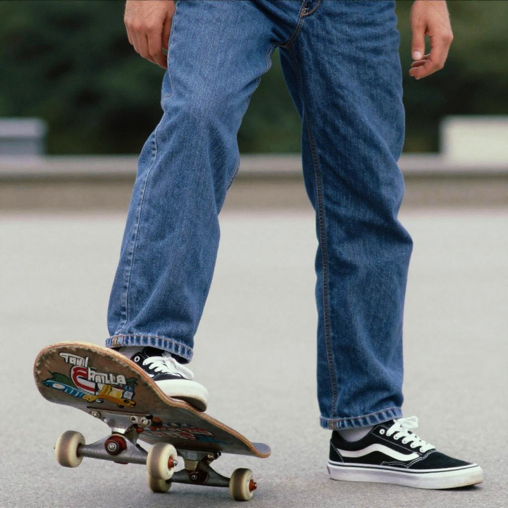 Photograph of a person's lower body in blue jeans and black-and-white sneakers, standing on a worn skateboard with colorful stickers.