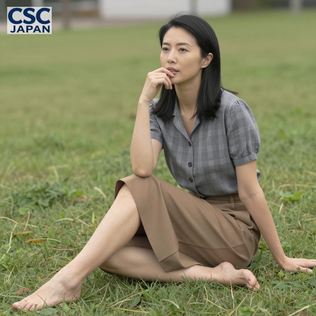 Photograph of a woman with short dark brown hair, wearing a gray t-shirt, standing in a tall grass field. She looks to the right with a neutral expression. Green grass with brown seed heads surrounds her, slightly blurred. Sunlight illuminates the scene.