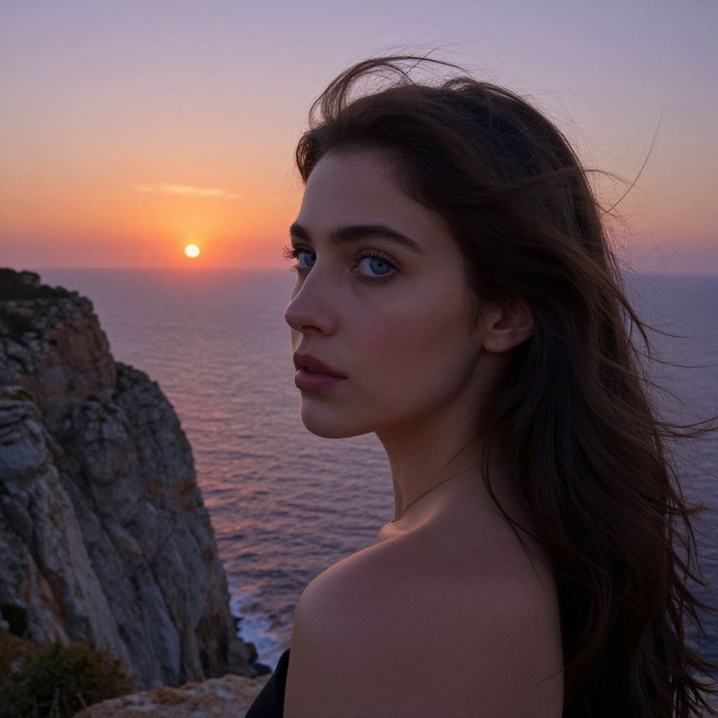 Craft a hyperrealistic portrait of a Middle Eastern woman with piercing blue eyes and porcelain skin, poised on a windswept cliff overlooking the North Sea at sunset. Her gaze, fixed on the horizon where the sun slowly descends beneath the waves, evokes a sense of serenity yet anticipation. As daylight wanes, the subtle shadows cast by the fading light accentuate the delicate texture of her hair and the contours of her face while the surrounding landscape transforms into a harmonious blend of warm oranges and purples. The portrait is captured from an unconventional perspective, slightly above and behind her right shoulder, offering an intimate glimpse that emphasizes her solitude amidst nature's majestic embrace.
