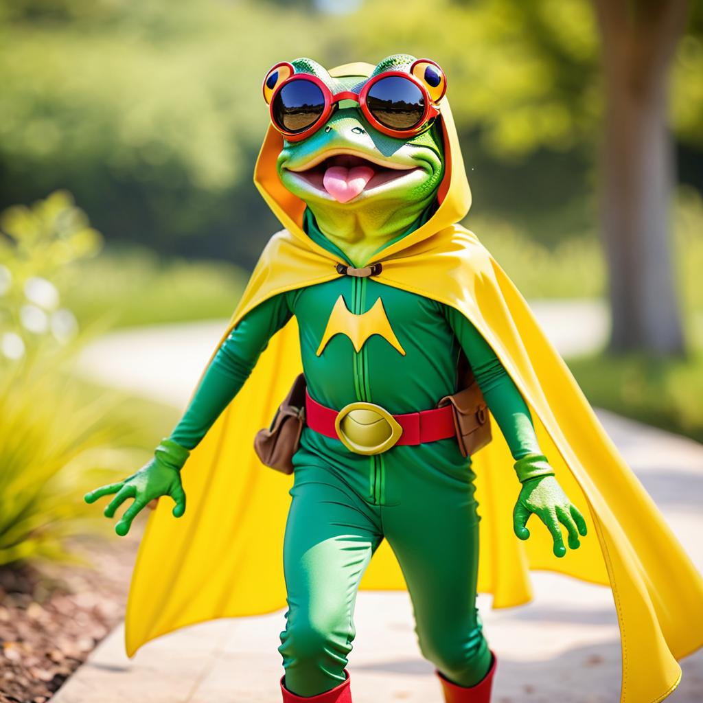 Full-body image of a person dressed in a green frog costume featuring green skin, a large frog head with an open mouth and tongue out. The character wears oversized red sunglasses and a bright yellow cape with a knot at the neck. A brown belt secures the green outfit, complemented by green gloves and pants. The background is outdoors with a blurred natural setting of trees and grass.