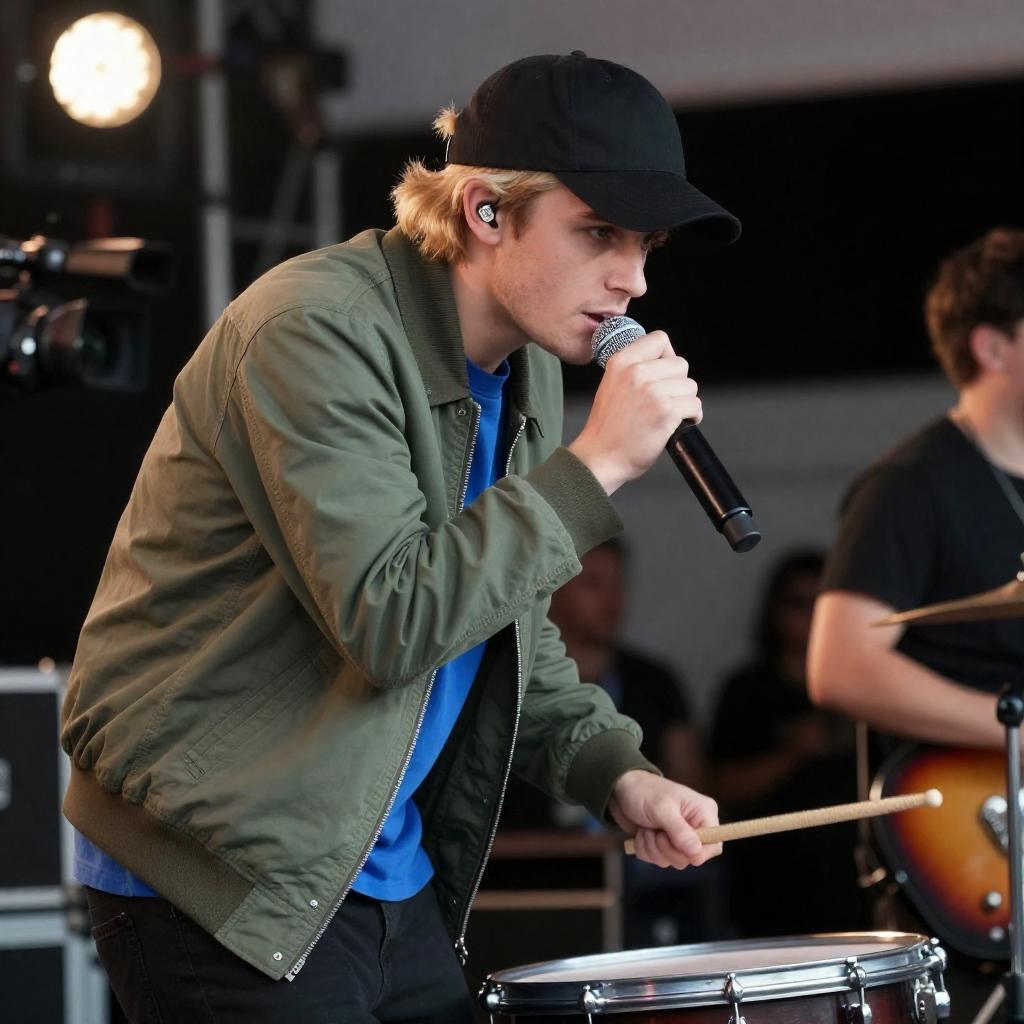 Live concert photograph of a young Caucasian male musician with blonde hair, wearing a black baseball cap, green bomber jacket, and blue shirt. He is holding a microphone in his right hand and a drumstick in his left hand, leaning forward intensely as he performs. The stage background features professional lighting, a camera operator, and partially visible band members or instruments.