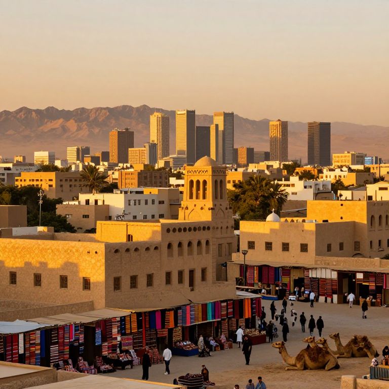 Mideast cityscape at sunset, ancient architecture blending with modern skyscrapers, bustling markets with colorful textile stalls, camels resting nearby, warm golden light illuminating sandstone buildings, desert mountains in the background, atmospheric and vibrant scene