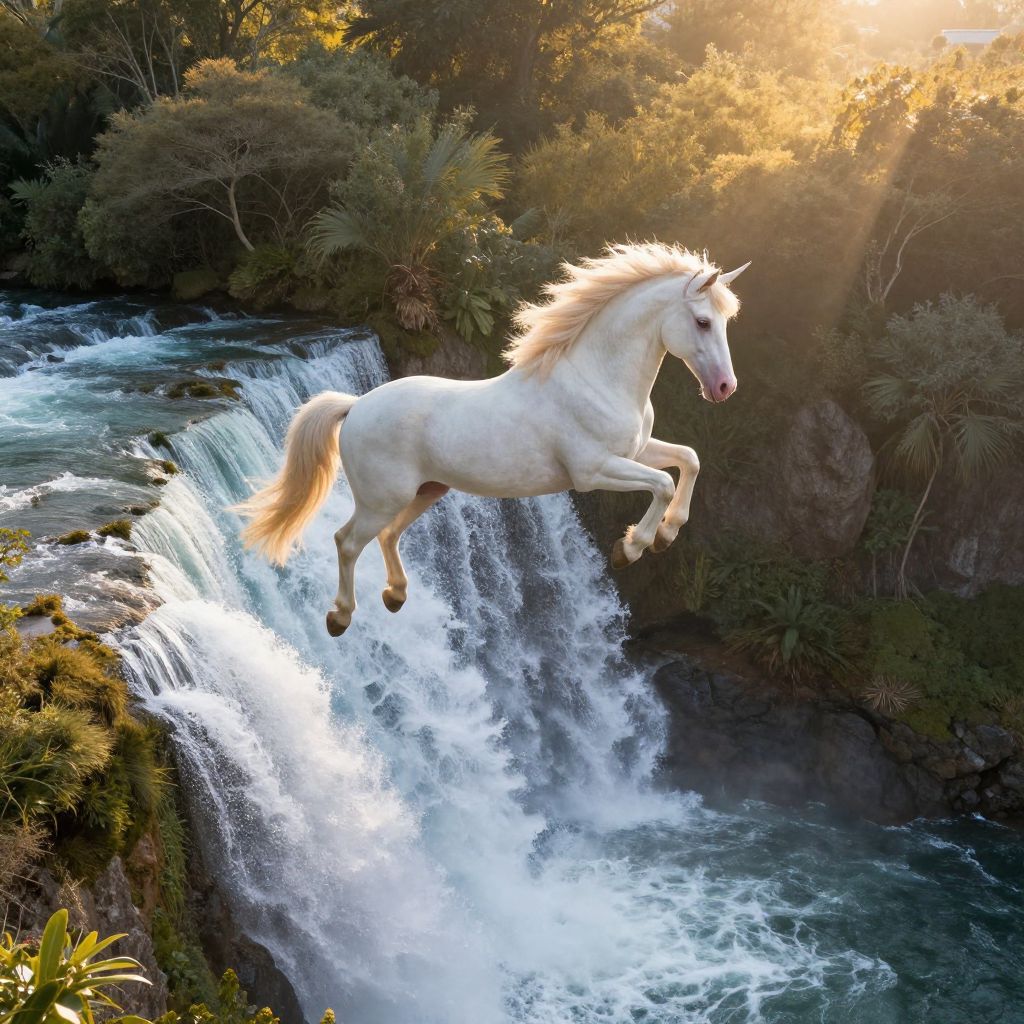 A surreal landscape emerges as the gaze traverses an otherworldly waterfall, beneath which a regal equine creature with an ethereal horn gracefully dives through veils of mist, blending harmoniously with the flowing water. The waters below swirl into pools of glimmering gold, mirroring the vibrant colors of a setting sun, painted in warm oranges and cool blues. Suspended above, a solitary figure draped in deep-blue robes glides alongside the mythical beast, clutching an ancient text filled with sketches of fantastical devices and cosmic charts. This scene, brimming with fantasy and intrigue, instills a profound sense of wonder and serenity as if one has stumbled upon a concealed realm where time is subject to the whims of imagination.