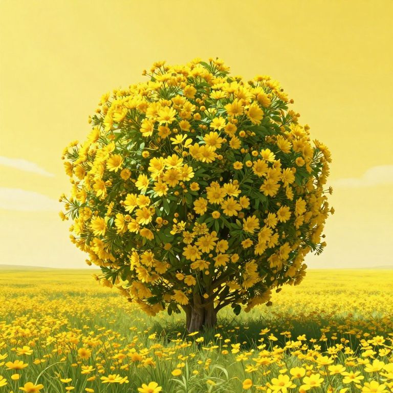 Photograph of a lush, yellow-flowered tree centered in a vibrant yellow field, under a bright, sunny sky. Yellow flowers blanket the ground,