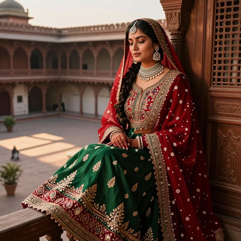 A beautifully detailed photo of a traditional Pakistani female dressed in a rich red and green anarkali saree with ornate lace and zari work, sitting on a wooden balcony in a historic Lahore house, her face adorned with traditional henna and a delicate silver jhumka, the sunset casting long shadows across the courtyard.