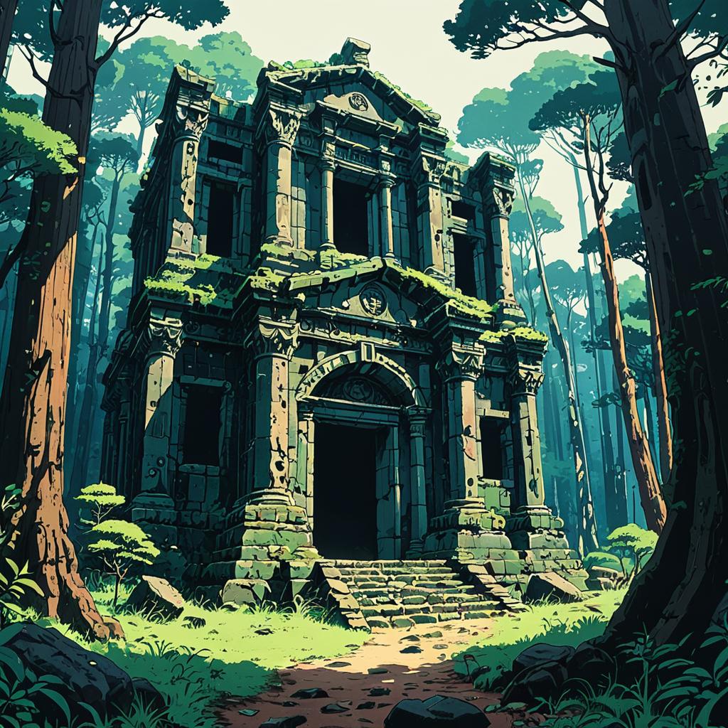 A cel-shaded vector art illustration of ancient stone ruins covered with moss, set in a dense, otherworldly forest. The architecture features classical columns and intricate carvings, surrounded by tall trees and lush greenery. The style is inspired by Studio Ghibli with a clean and polished maximalist design.