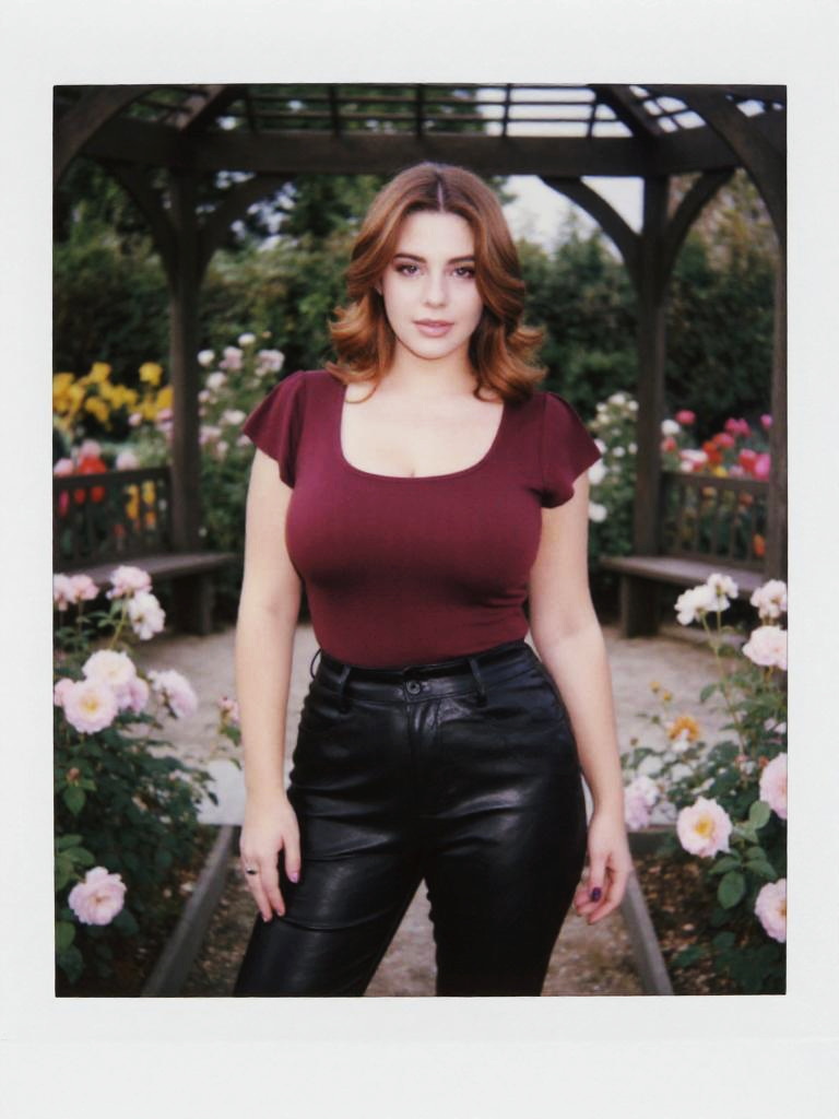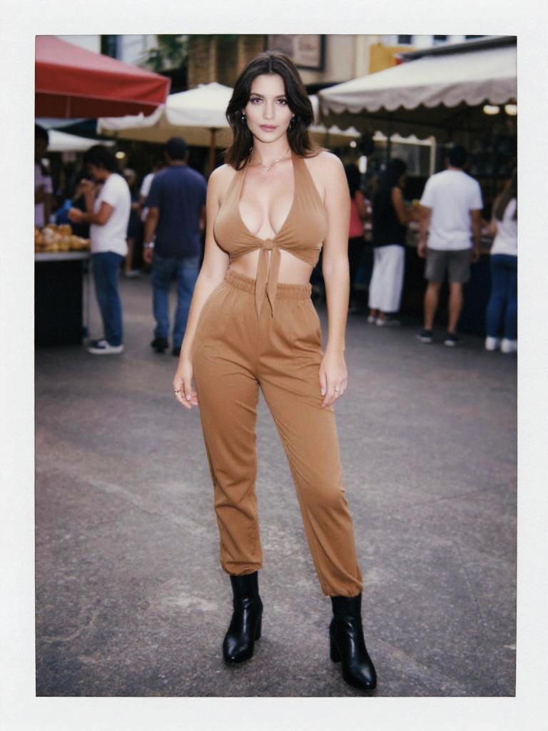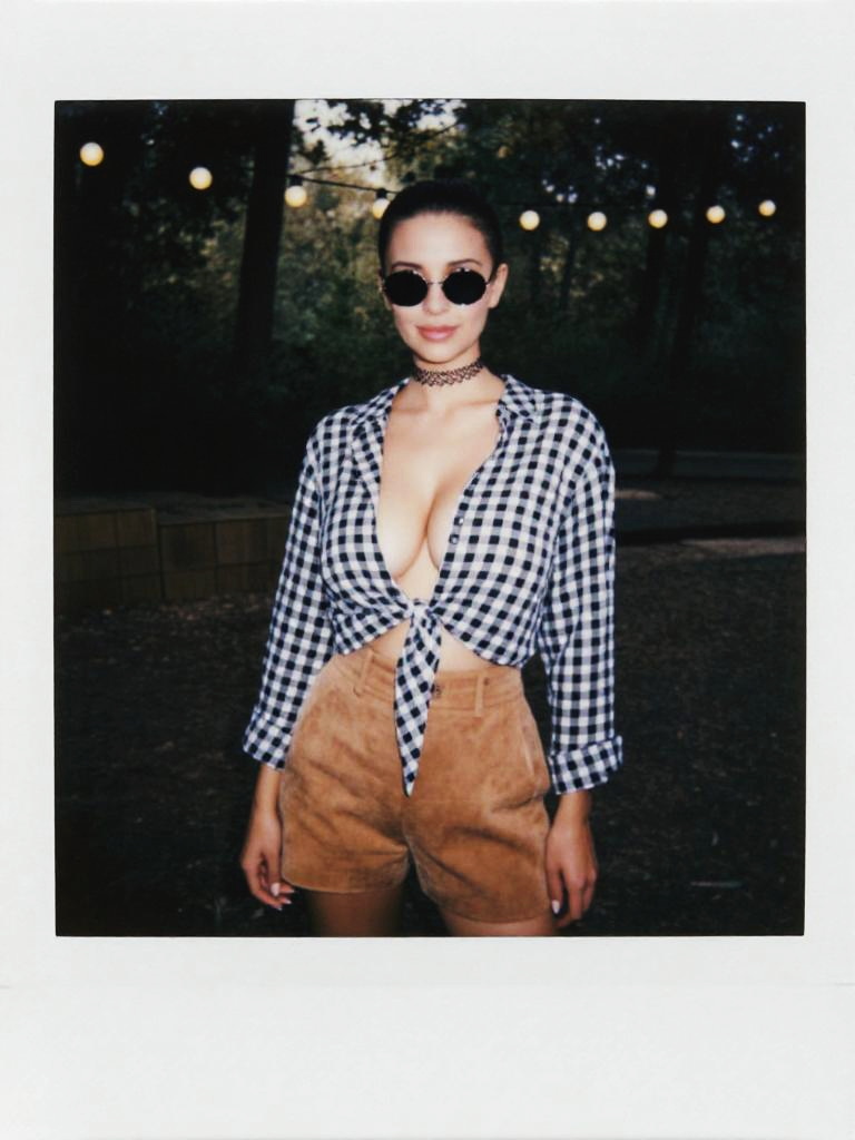 A tall woman in a casual black and white gingham shirt and tan suede shorts stands under string lights in a forest clearing, captured in the nostalgic style of a Polaroid instant camera. She wears a black choker necklace and dark round sunglasses, embodying a relaxed yet stylish vibe. Sexy. Pretty face and beаutiful eyes. Big breasts