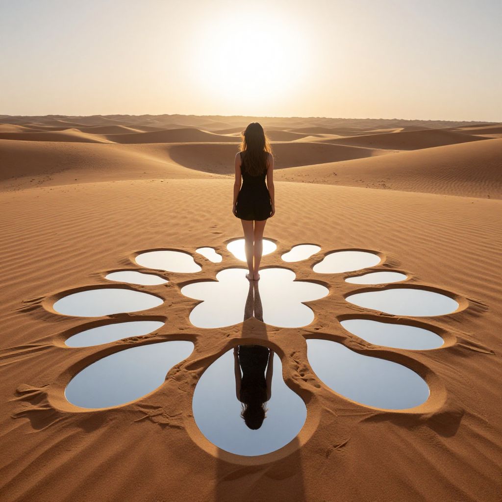 Woman standing in a vast desert under a radiant sun, her silhouette framed by a mesmerizing pattern of interlocking, mirror-like shapes etched into the sand beneath her feet, each reflecting a unique emotional resonance.