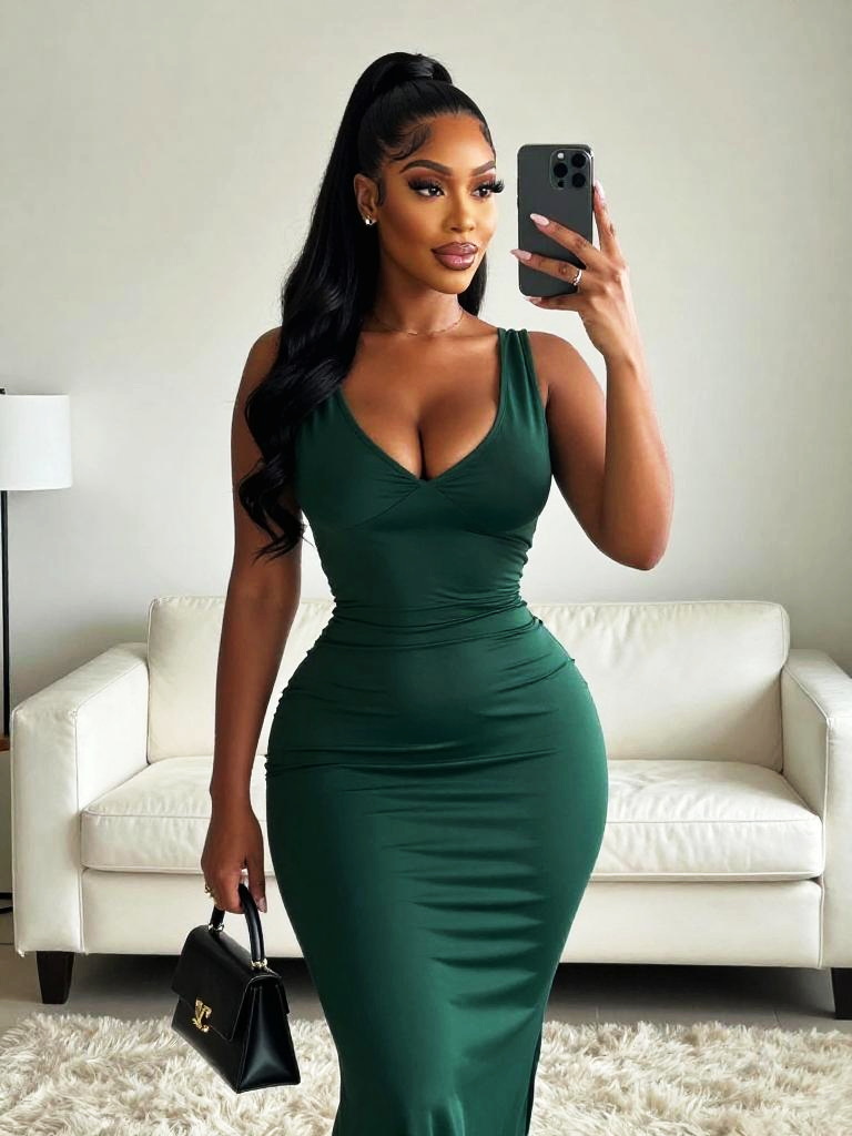 Mirror selfie of a stylish huge breast woman, curvy woman with caramel skin and dramatic eyeliner, wearing a navy blue figure-hugging midi cocktail dress with a deep V-neckline, hair styled in center-parted straight hair, holding a small structured top-handle purse handbag, standing in a modern bright apartment with bright room with soft beige furniture, soft soft indoor ambient light, glossy high-resolution fashion photograph