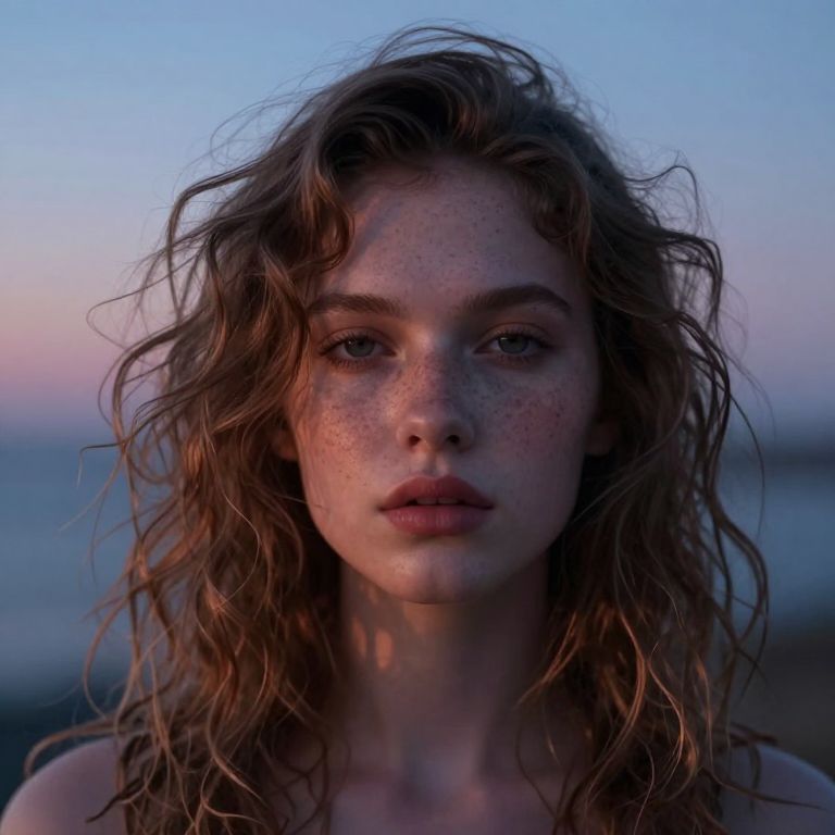 An ethereal portrait bathed in a gradient of twilight hues, where cascading curls of light and shadow frame a face marked by celestial freckles, hinting at a timeless, otherworldly existence.