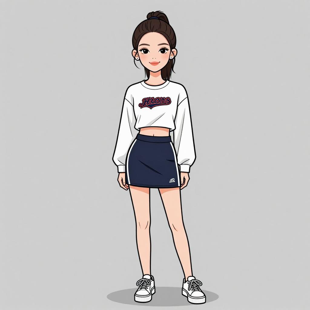 This digital illustration depicts a young woman with fair skin and dark brown hair in a high ponytail. She has large, expressive eyes and a slight smile. She wears a white, long-sleeved crop top with a purple graphic on the chest, and a short, navy blue athletic skirt with white side stripes. Her outfit is completed with white sneakers. The background is a simple, solid light blue, putting full focus on the character. The style is clean and minimalistic, with bold outlines and flat colors.