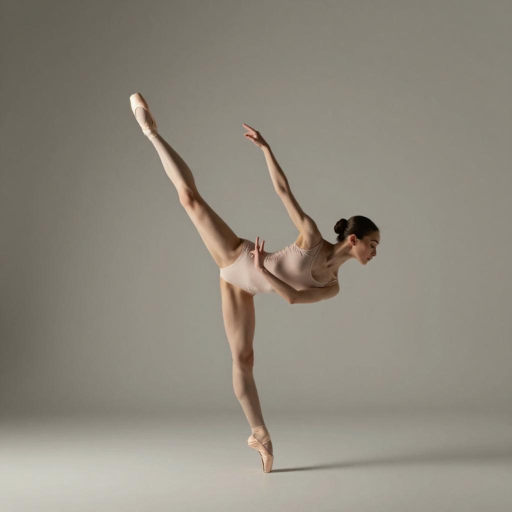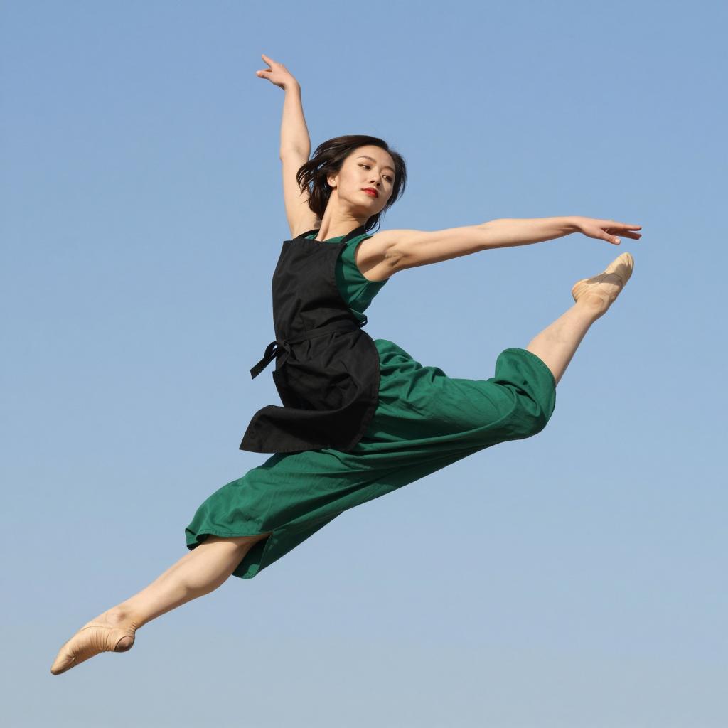A graceful woman in a flowing green dress with a black apron is captured mid-leap against a clear blue sky. The image showcases a dynamic pose, highlighting the movement and elegance of her skirt and the confident expression on her face, all rendered in a detailed, realistic digital art style.