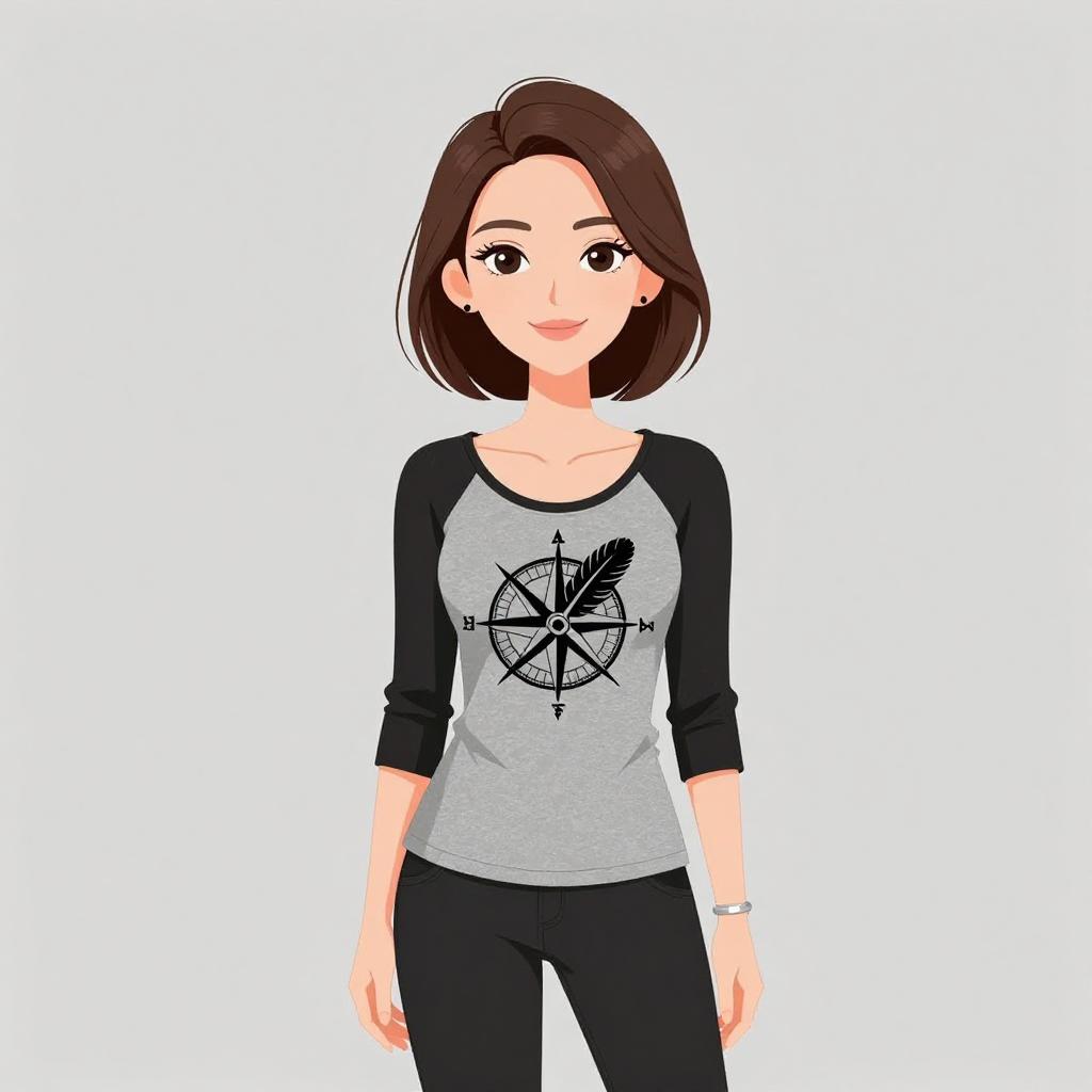 Digital illustration of a smiling woman with short brown hair, wearing a grey and black raglan shirt with a compass design, and black pants, against a