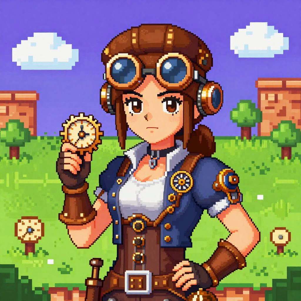 An extreme long shot showcasing a vibrant 8-bit landscape. The central figure is a steampunk mechanic woman with copper goggles, embodying inventor of clockwork devices. This pixelated masterpiece captures the essence of retro video games, influenced by the styles of James Jean and Ayami Kojima.