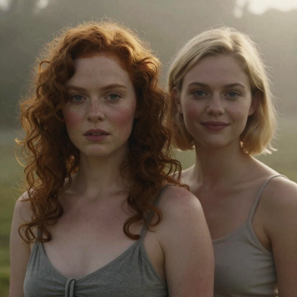 Upper body, 2girls, couple, gentle girl with short honey blonde bob and subtle freckles, vivacious woman with curly fiery red hair and silver hoop earrings, black dress, white dress, sleeveless, spaghetti strap, bare shoulders, jewelry, earrings, hand on another's hip, hand on another's waist, breast press, symmetrical docking, tender hug, red background