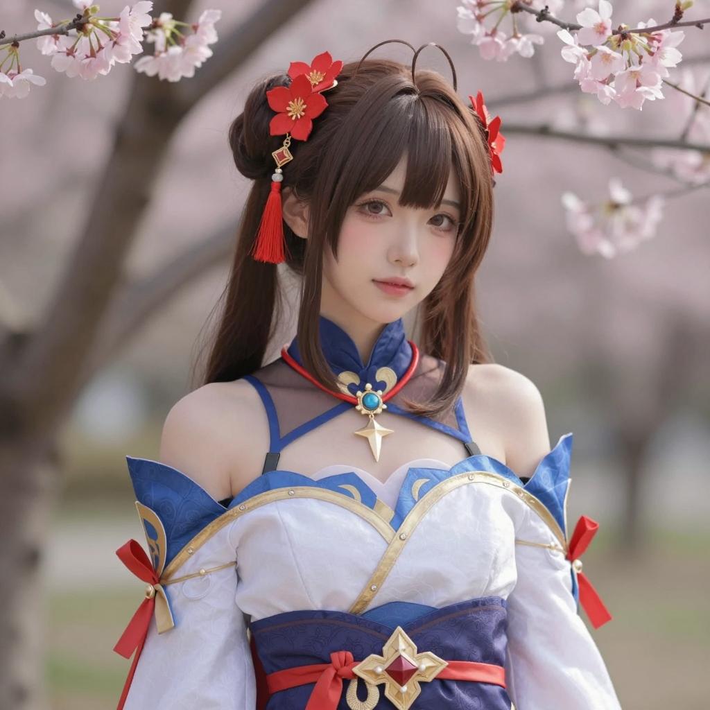 Girl tengen cosplay, photorealistic, Asian woman, young, cute, medium-length brown hair in twin ponytails, bangs, wearing blue and white traditional dress with gold and red trim, off-the-shoulder sleeves, red flower hairpins, necklace with star pendant, standing in a garden, pink cherry blossom branches in background, daylight, soft focus, realistic ures, digital painting style, detailed clothing and hair, serene expression, waist-up view, natural light, slightly tilted head, slight blush on cheeks