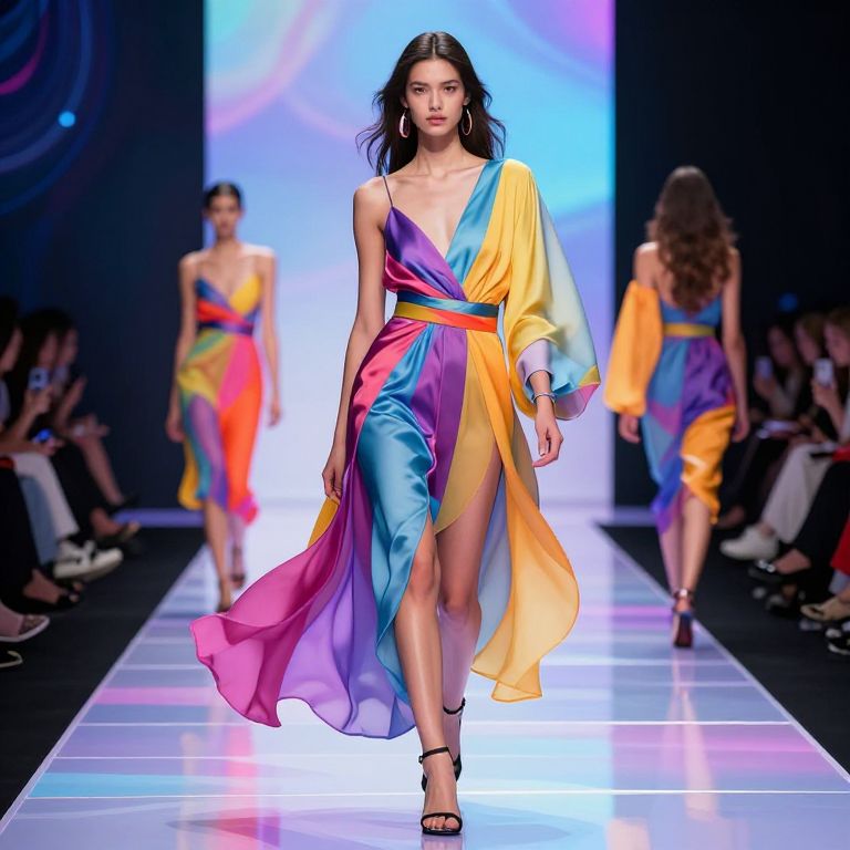 Sexy clothes AI-designed in a modern digital fashion show setting, vibrant colors, dynamic angles, synthetic fabrics with subtle movement effects, illuminated runway with holographic reflections, studio lighting, vivid colors, sci-fi fashion innovation.