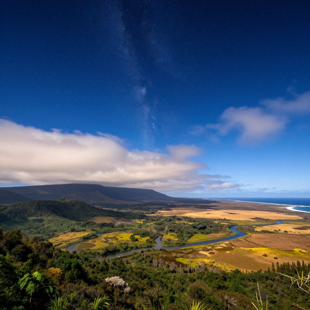 Big island, a mesmerizing scenery of clouds and stars showing a natural landscape, celestial objects in a beautiful sky, rainforest, rivers, desert, marsh, coastline, meadow, dusk, the most beautiful image in the world, <8k, high detail, uhd, sharp focus, palette, photorealistic, absurdres, extreme detail, as much detail as possible>, bright indigo, dark azure, shiny coral, shiny yellow, matte beige