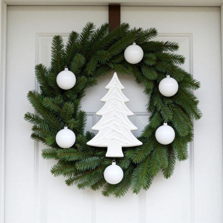 Handcrafted white ceramic Christmas tree decorates a festive wreath made of green pine branches, adorned with six round white ornaments, all mounted on a white front door as a unique holiday display crafted by DearloveDecorDesign on Etsy.