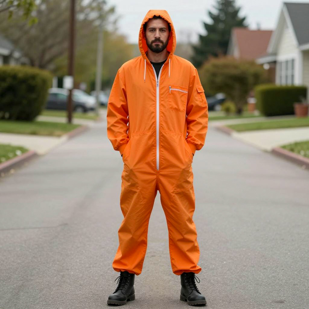 Jailbird costume orange, photograph of a man standing, full body, wearing an orange and black striped hoodie, orange pants, black gloves, black boots, hood up, plain beige background, slightly ured wall, front view, casual pose, realistic style, medium shot