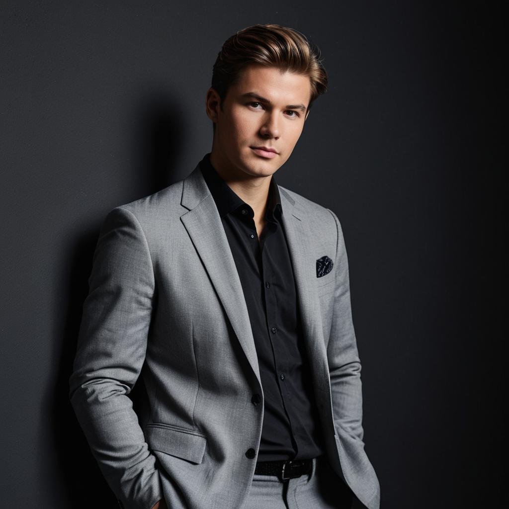 Photorealistic portrait of a handsome young man with short brown hair and green eyes, wearing a beige suit jacket over a teal button-up shirt and a white t-shirt underneath. The subject poses confidently with hands in pockets against a plain gray studio background, showcasing modern formal attire and a composed expression.