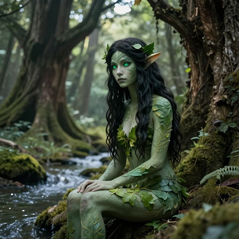Digital fantasy artwork depicting a green-skinned, elf-like woman with long, wavy black hair, sitting by a forest stream. She has pointed ears, glowing green eyes, and her body is adorned with leaf-like patterns. She wears a minimalistic leaf dress. The forest background is dense with tall trees, moss-covered rocks, and sunlight filtering through the canopy. Her expression is serene, and her hands rest gently on her lap. The overall color palette is rich with greens and browns, creating an enchanted woodland atmosphere. The image has a realistic yet magical style.