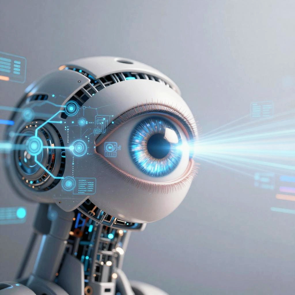 Free visual AI concept art featuring an advanced robotic eye emitting digital light beams, surrounded by intricate neural network patterns and abstract data visuals, set against a gradient background with tech motifs and glowing circuit elements.