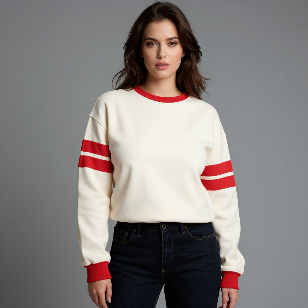 "Woman, casual sporty, cream crewneck sweatshirt with red horizontal stripes on sleeves, graphic design on chest area, layered over a red cuff, dark denim jeans, straight cut, studio grey background. Sexy. Pretty face and beаutiful eyes. Big breasts."