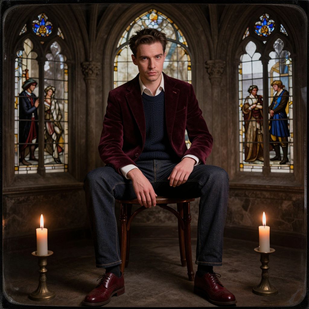 Photograph of a young Caucasian man with short brown hair, sitting on a wooden chair in a dimly lit, Gothic-style room with stained glass windows. He wears a dark red velvet blazer over a white shirt and navy sweater, paired with dark blue jeans and brown leather shoes. Two lit candles on brass holders are placed on either side of the chair. The stained glass windows depict medieval figures in colorful, intricate designs. The man's serious expression contrasts with the warm candlelight and the rich textures of the velvet and stone surroundings.