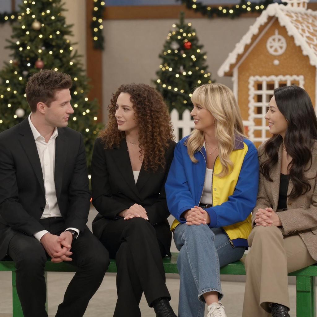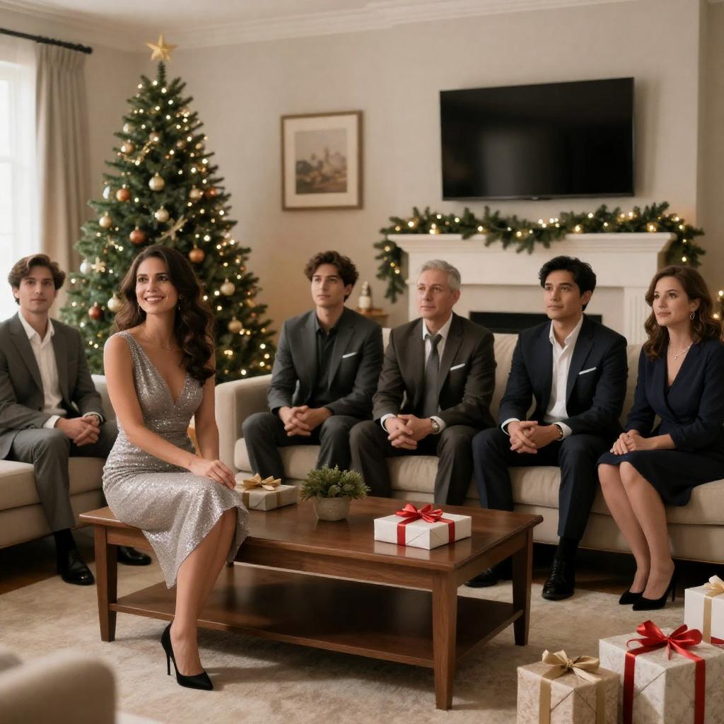 Photograph of a Christmas-themed musical performance. Five people sing and dance around a black grand piano. Woman in black polka-dot dress and man in leather jacket with sunglasses sing in foreground. Man in plaid shirt stands behind microphone on stand. Man in plaid shirt and woman in red dress sing in background. Christmas tree with colorful lights to the left. Reflective piano surface. Decorated room with yellow walls, mirrored frame, and garland. Piano player in foreground smiles.