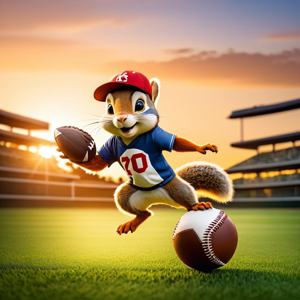 A squirrel wearing a baseball cap playing football at sunset. The scene captures a playful atmosphere with dynamic action.