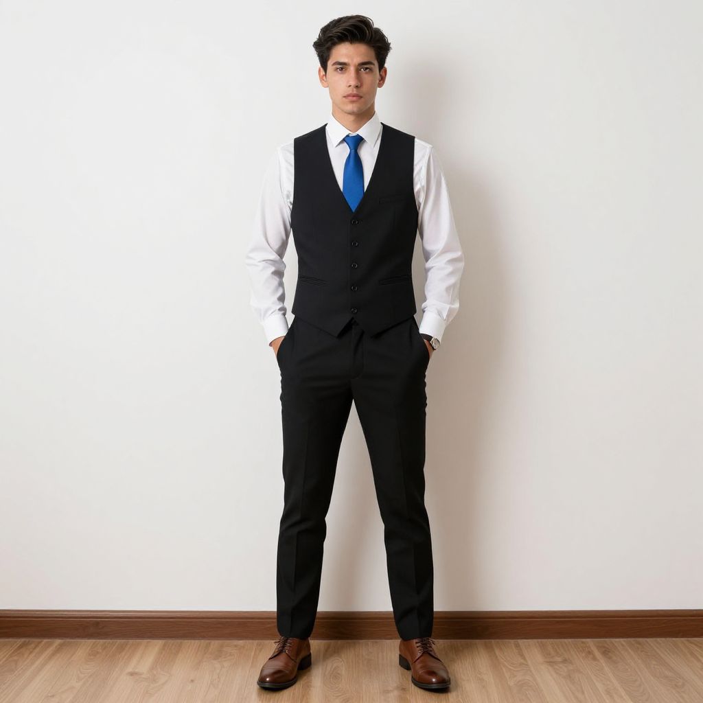 Photograph of a young man standing confidently against a plain white wall. He's wearing a white dress shirt, black vest, black trousers, and brown leather shoes. His blue tie contrasts with his shirt, and he's got his hands in his pockets. His dark hair is neatly styled, and he has a serious expression. The floor is light wood, and the baseboard is dark brown.