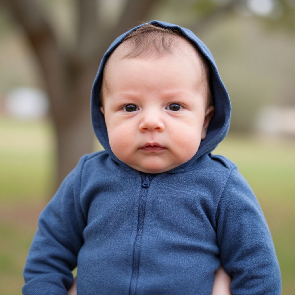 Photograph of a chubby-cheeked baby with fair skin and dark brown eyes, wearing a navy blue, zip-up hoodie with the hood up. The baby has short, dark brown hair peeking out from under the hood. The background is blurred but shows a grassy area with trees, indicating an outdoor setting. The baby's expression is neutral, and the texture of the hoodie appears soft and slightly fuzzy. The lighting is natural, highlighting the baby's face.