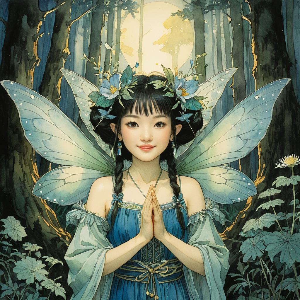 A cheerful, optimistic fairy, looks similar to Dakota Fanning, in the forest, dim light, magical, detailed, Chinese watercolor, fantasy, portrait by Arthur Rackham, inspired by John Bauer's 'The Princess and the Troll' 1913