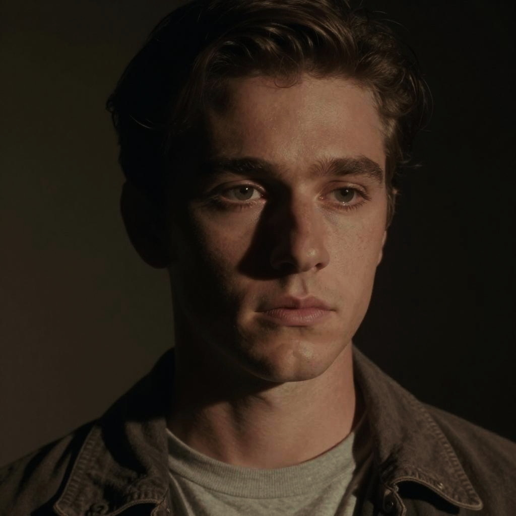 Tobin bell young character close-up, dramatic shadows, vintage film style, high contrast, moody atmosphere